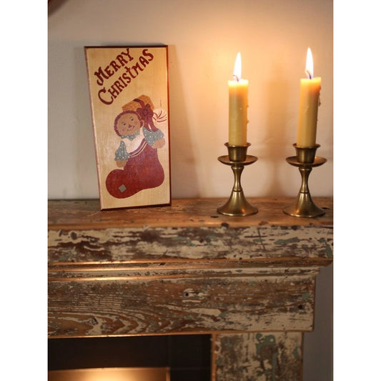 Hand Painted Merry Christmas Wooden Wall Sign With Rag Doll & Stocking Design 16" X 7" Sawtooth Hanger Vintage Look Holiday Decor