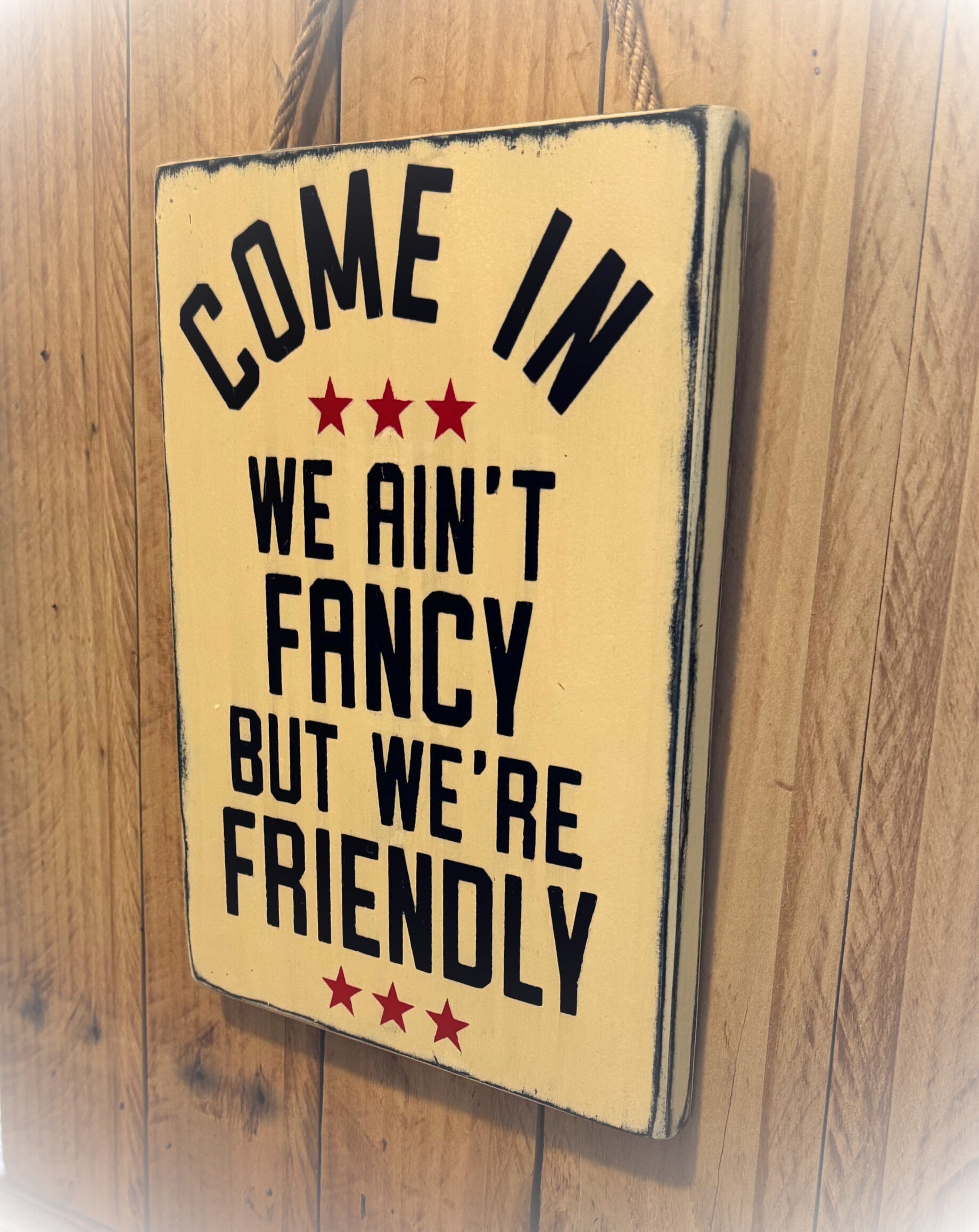 Welcome guests with charm and humor! This rustic handmade wooden sign measures 7.25" x 10" x 0.75" and features the fun and welcoming phrase, "Come In, We Ain't Fancy But We're Friendly." Perfect for adding a touch of personality to your home, porch, or business entryway.