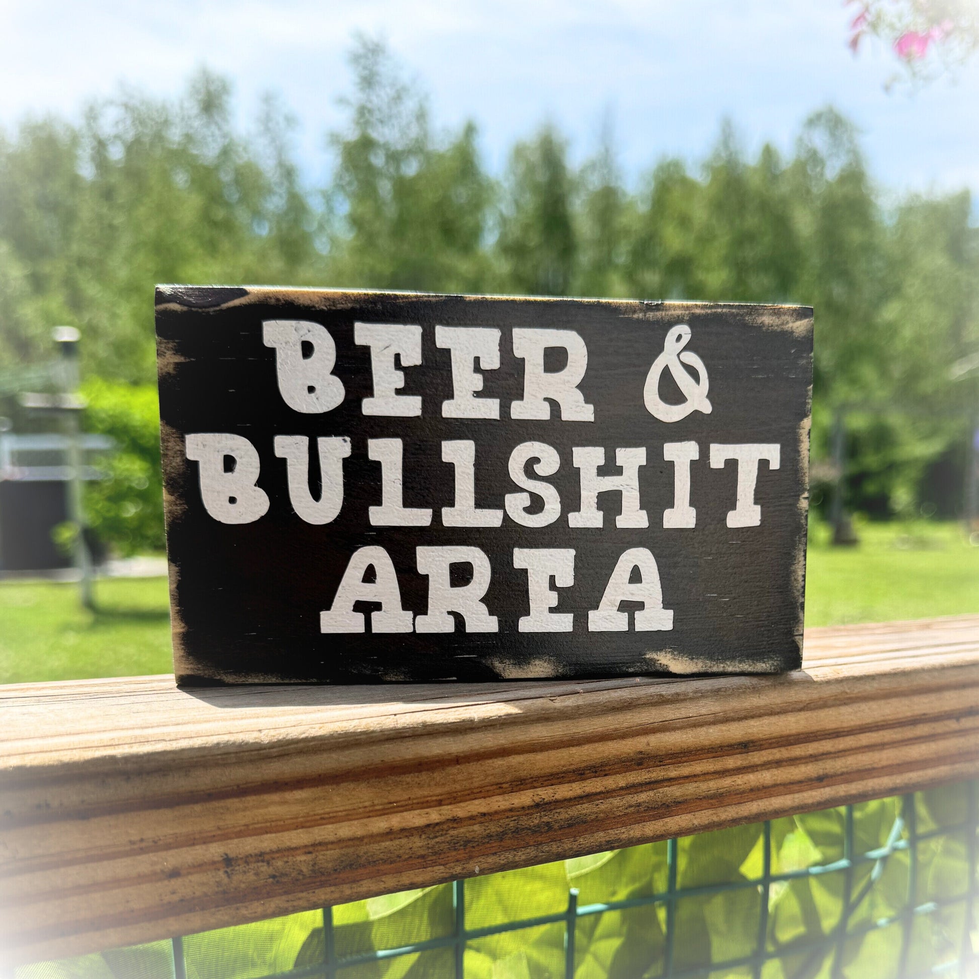 The sign proudly displays the humorous message, "Beer and Bullshit Area". You have the freedom to customize this sign by selecting from a range of vibrant colors for the background (see last picture) and black or white for the lettering, ensuring it complements your existing decor or stands out as a focal point.