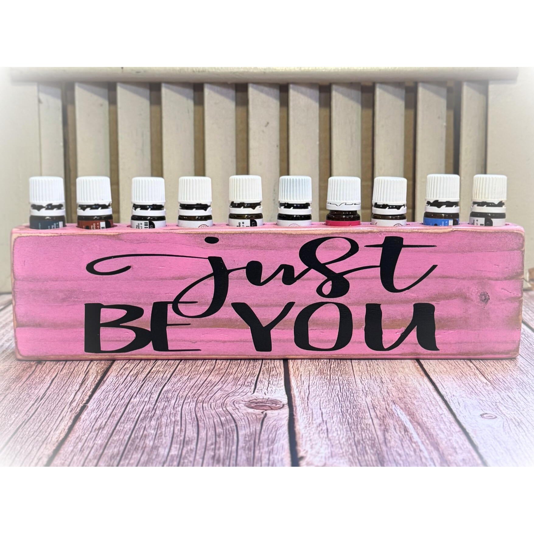 Handmade Essential Oil Holder – Holds 10 Bottles – “Just Be You” – Customizable Colors – Rustic Wooden Storage - Essential Oil Gift