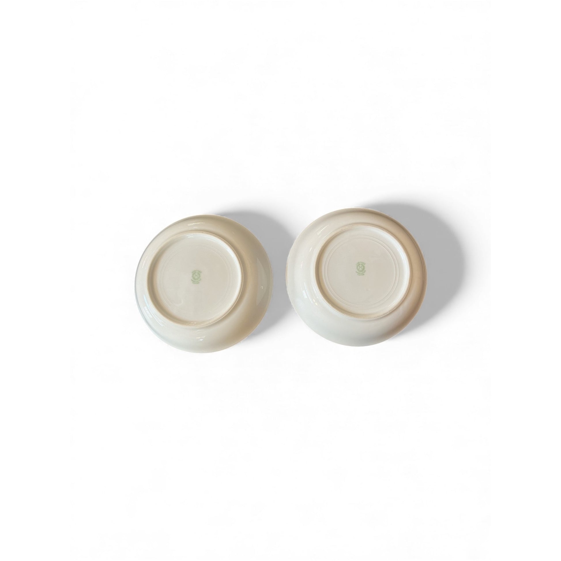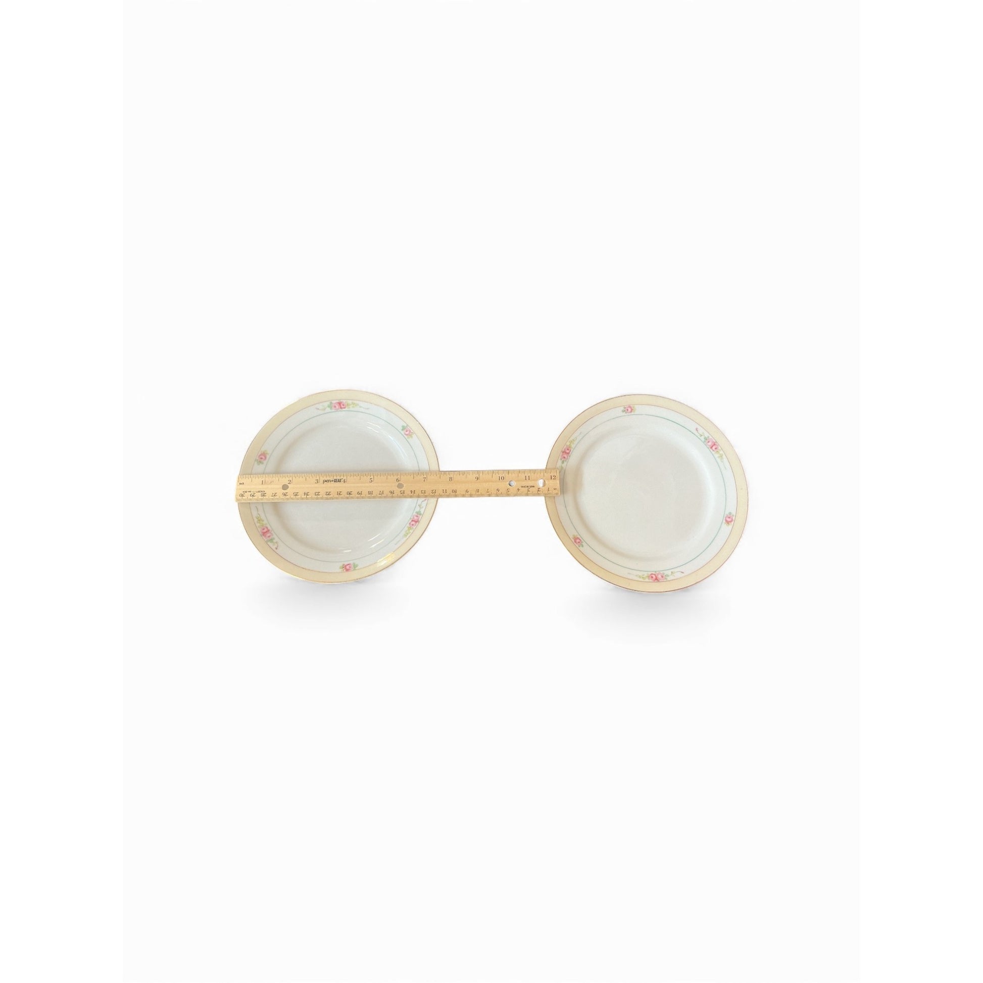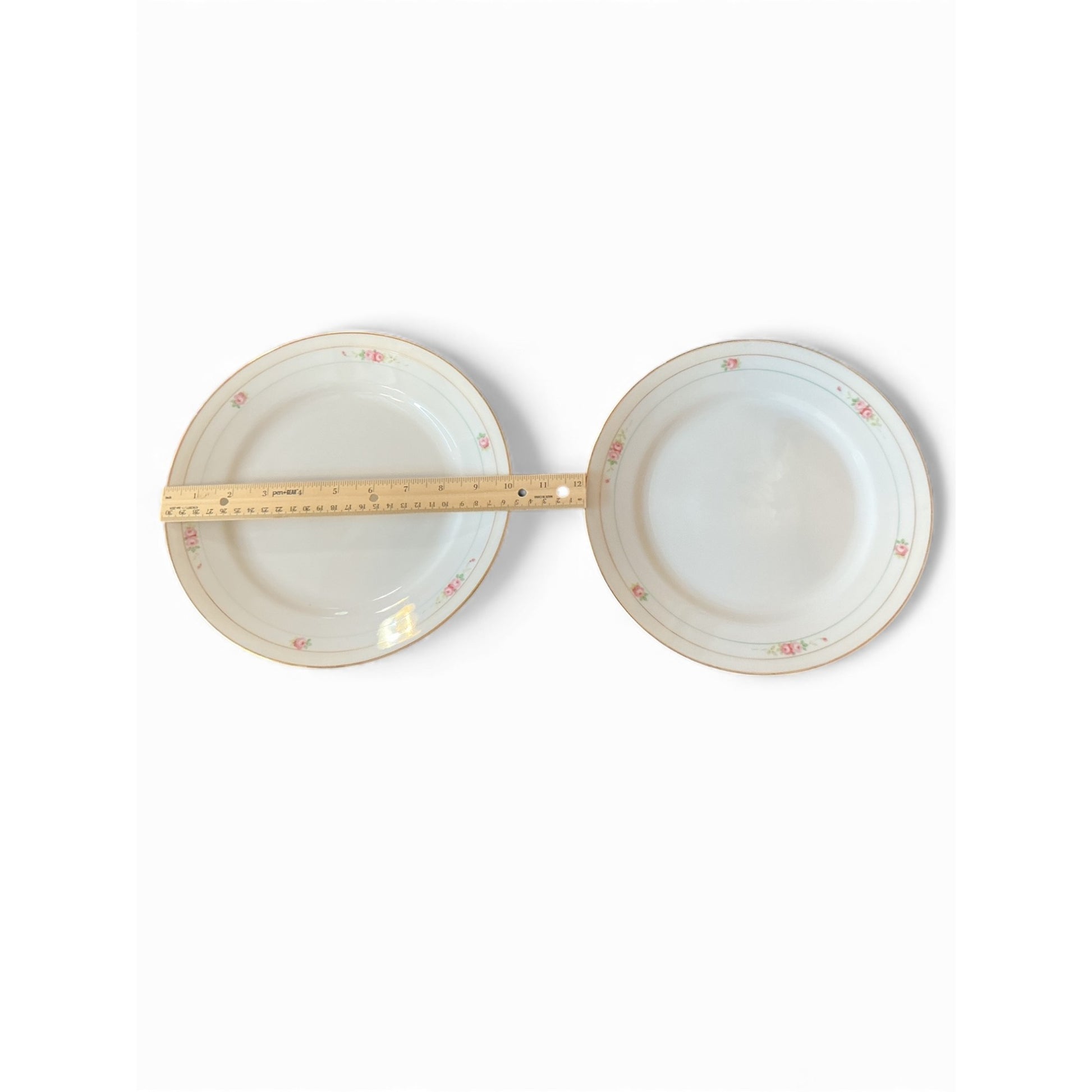 Top to bottom plates = 10", 8", 6". Bowls = 6" diameter. Minor wear on gold trim consistent with age.